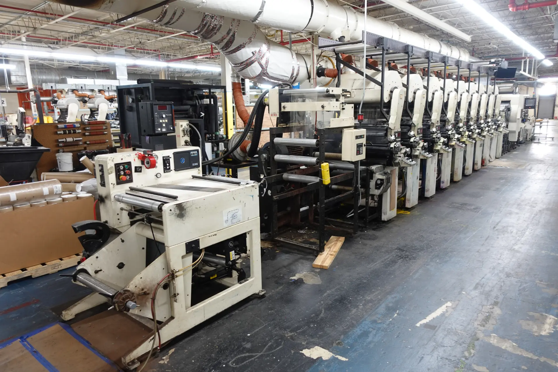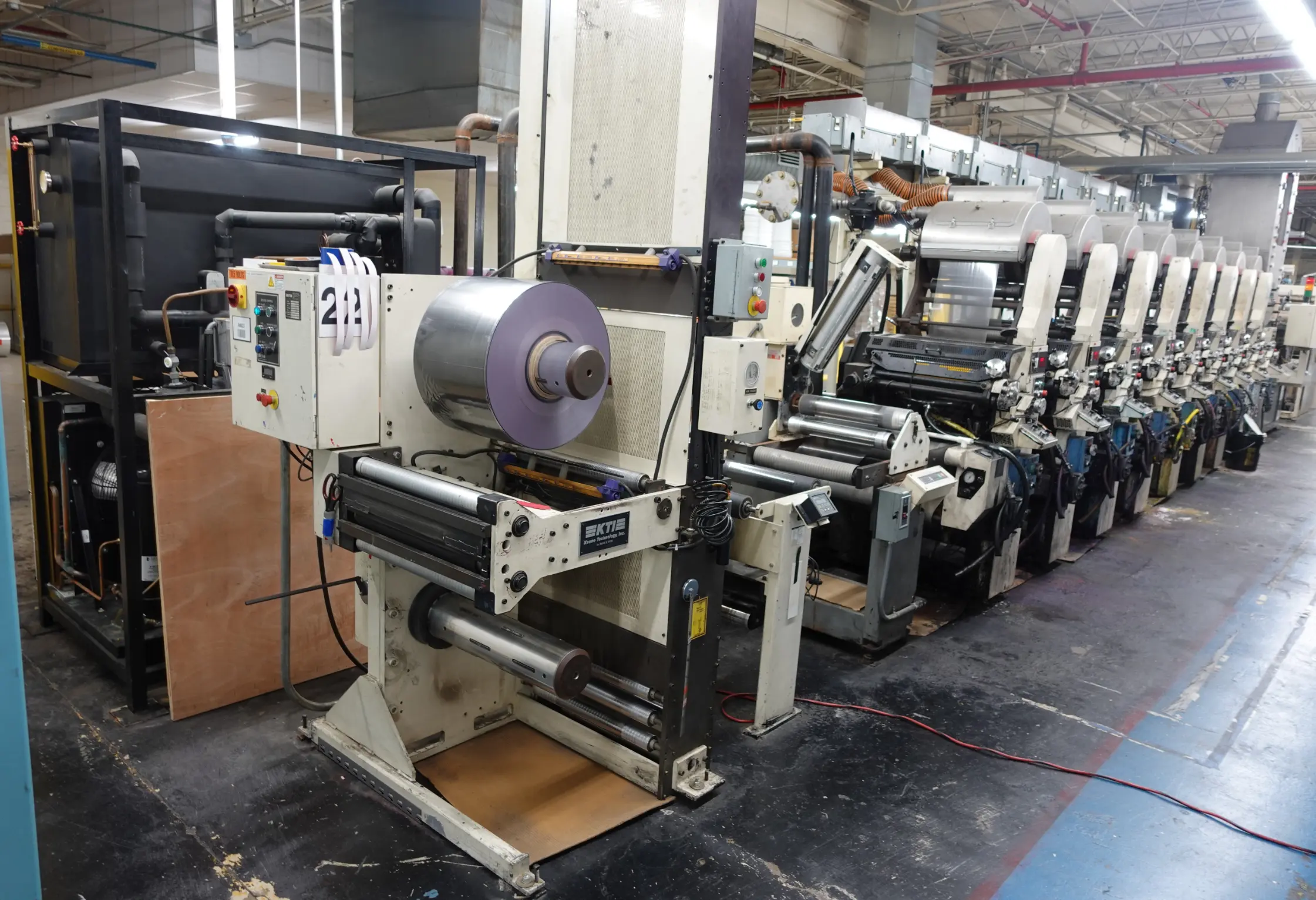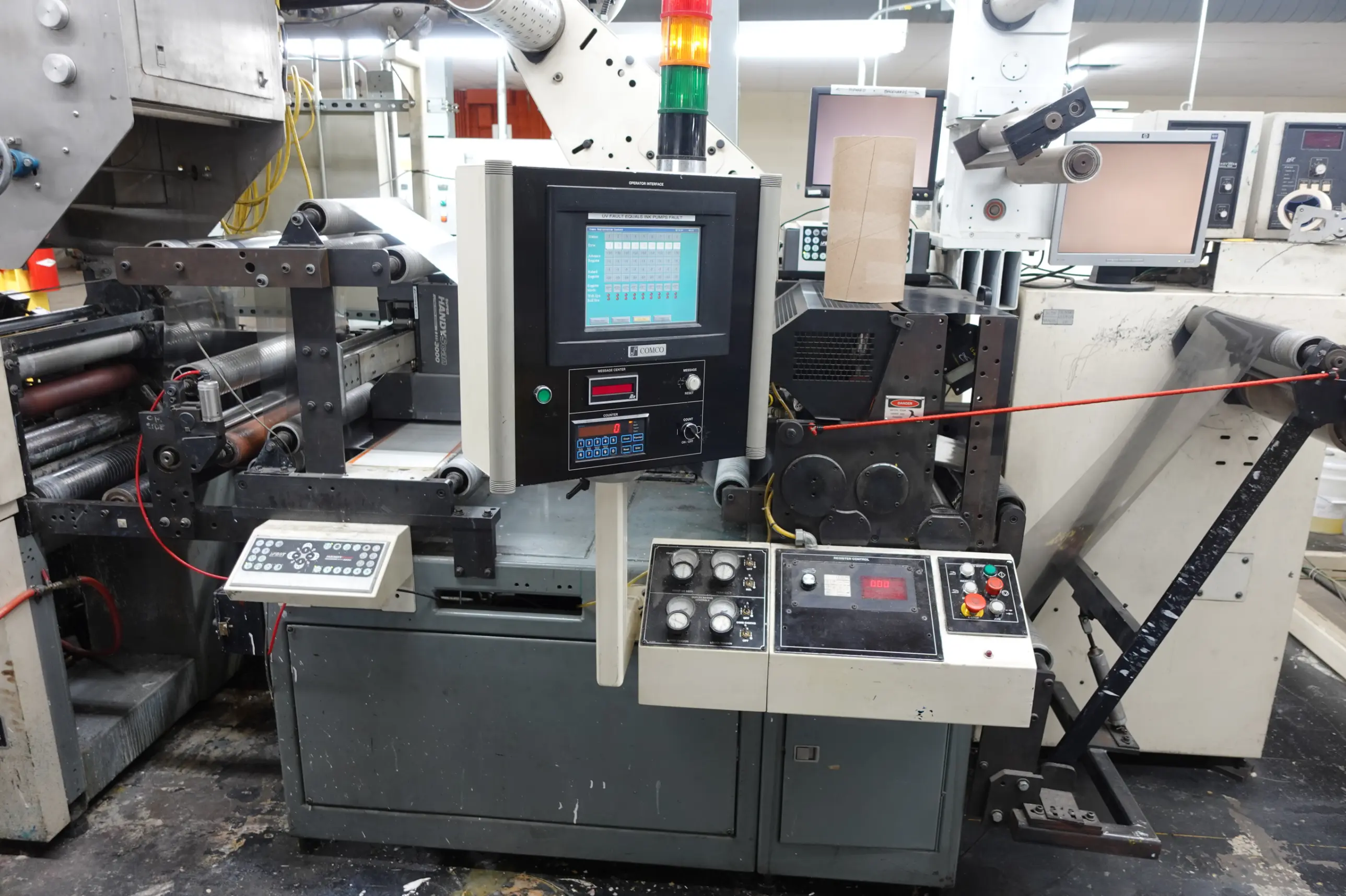 - Comco Commander 22" Flexographic Press — 8 Print Units, Water-Based, UV, & Solvent-Based Inks, Minimum Web Width 11", Maximum Web Width 22". Equipped with Die Cutting and Perforating Stations, Roof-Mounted Drying System, Sterlco Temperature Control for Chilling Rolls & Process Cooling, PC Industries PQV Print Quality Verification System, and Adjustable Controls for Material Thickness Compensation.