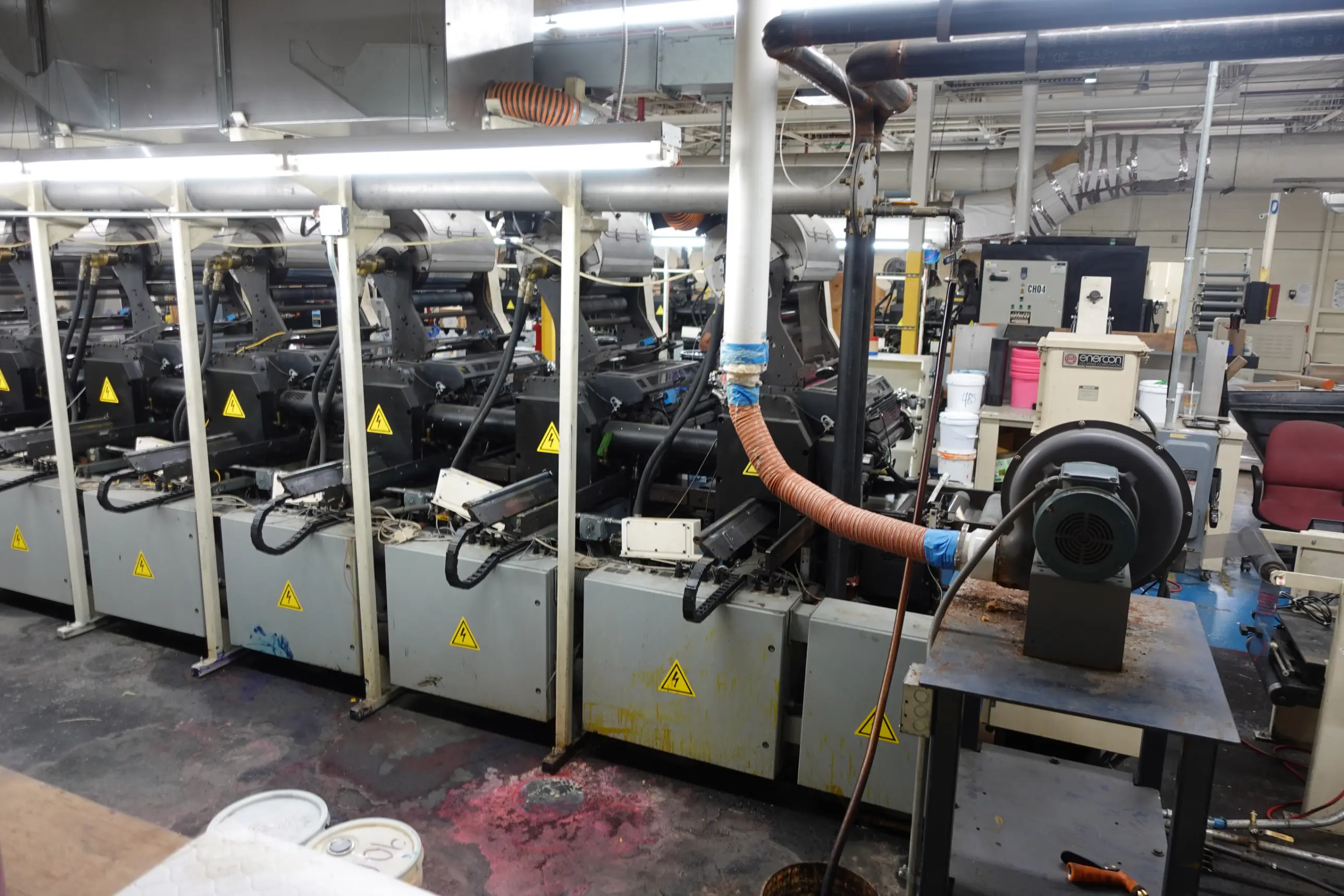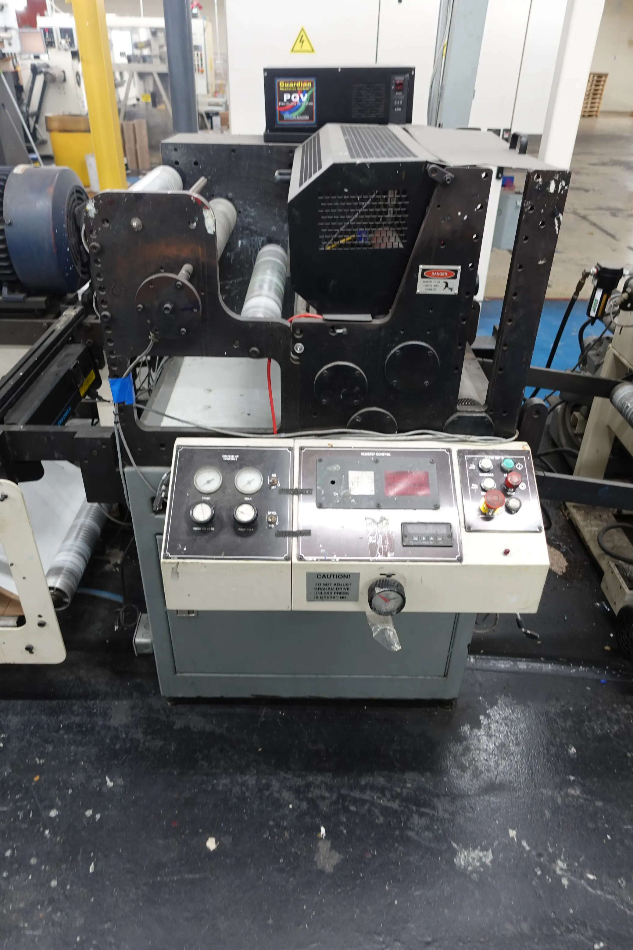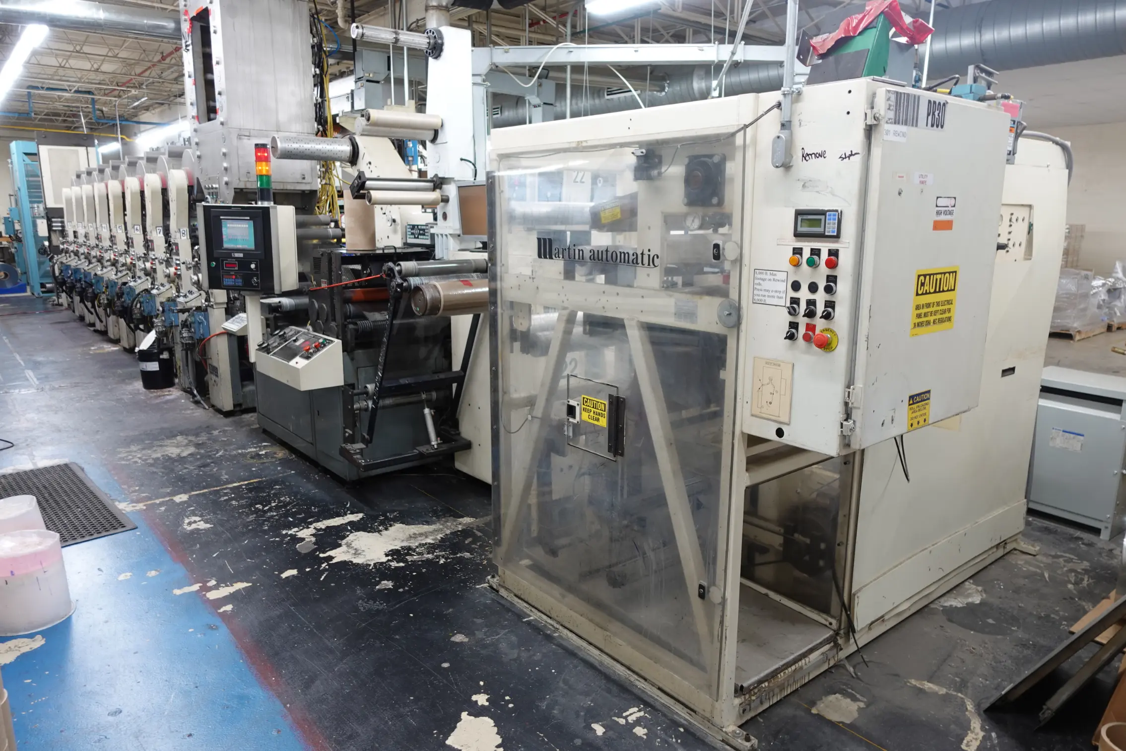 - Comco Commander 22" Flexographic Press — 8 Print Units, Water-Based, UV, & Solvent-Based Inks, Minimum Web Width 11", Maximum Web Width 22". Equipped with Die Cutting and Perforating Stations, Roof-Mounted Drying System, Sterlco Temperature Control for Chilling Rolls & Process Cooling, PC Industries PQV Print Quality Verification System, and Adjustable Controls for Material Thickness Compensation.